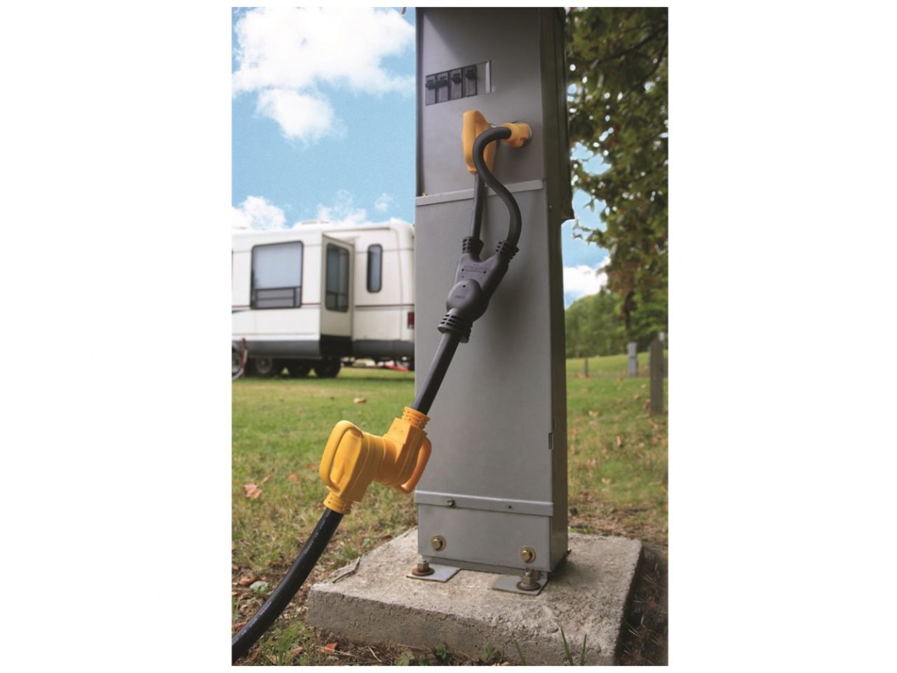 - Draws the combined power from a 15 and 30 AMP outlet, which allows your RV to receive up to 45 AMPs