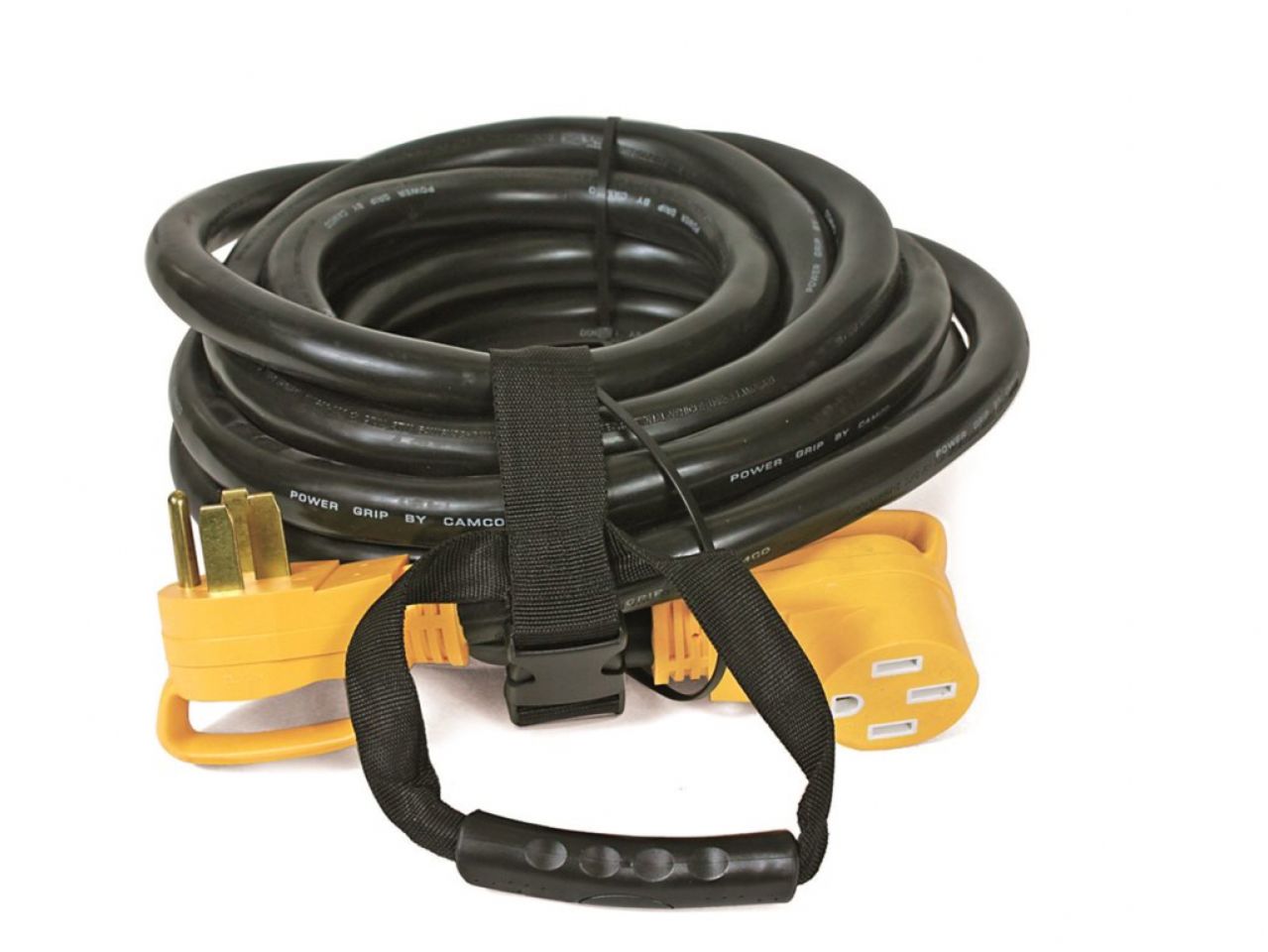 Camco 30' RV Extension Cord with Handle is a 50 AMP cord with handles. It features the patented power grip handles for ease of use. This cord includes a convenient carrying strap.