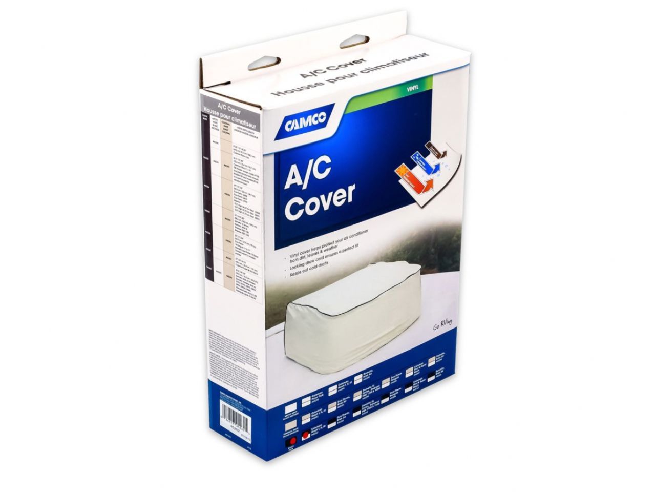 Camco's Black Vinyl RV Air Conditioning Cover protects your RV air conditioner from dirt, leaves and weather. Locking draw cord ensures a perfect fit. Helps keep out cold drafts. Includes aerodynamic shroud. Fits Coleman Mach I, II and III. Do not operate vehicle with cover installed.