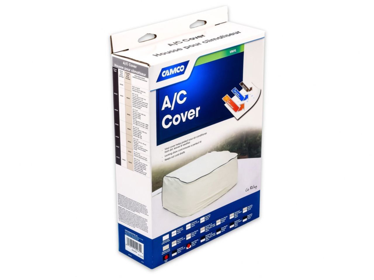 Camco's Black RV Vinyl Air Conditioner Cover protects your RV air conditioner from dirt, leaves and weather. Locking draw cord ensures a perfect fit. Helps keep out cold drafts. Fits DuoTherm models. Do not operate vehicle with cover installed.