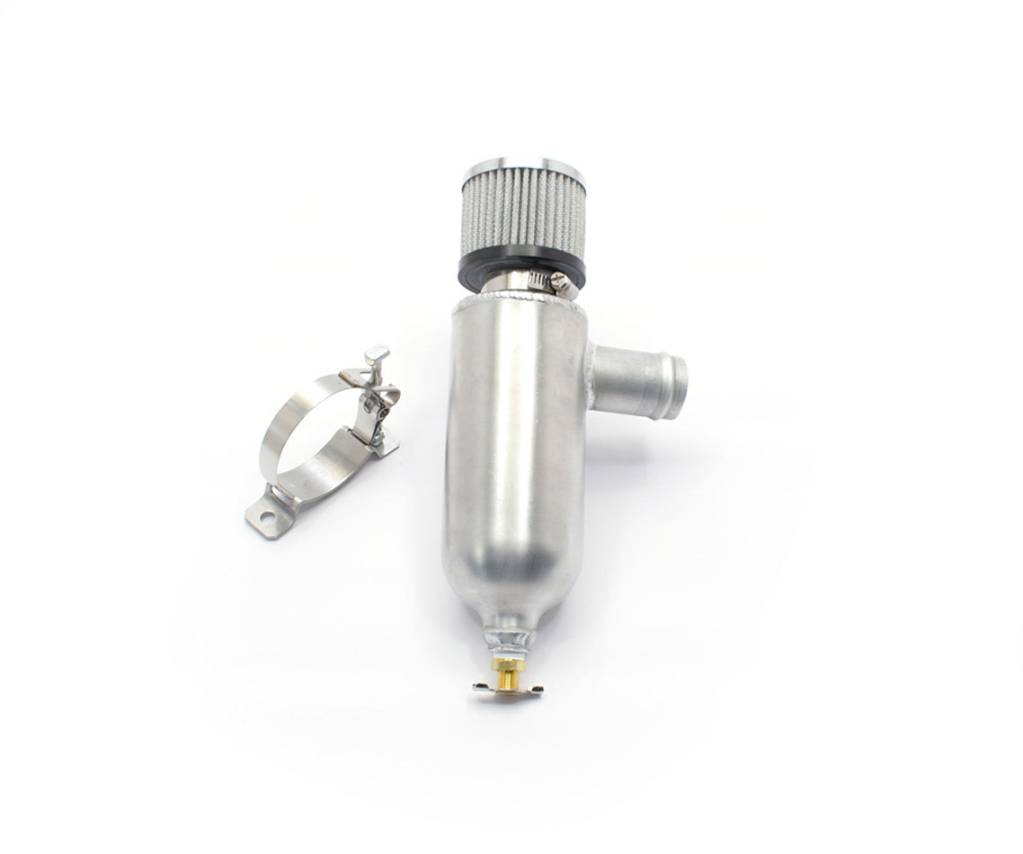 Breather Tank - 3-1/4 in Diameter x 11-1/4 in Tall - 1-1/2 in ID Hose Barb Inlet - Petcock Drain - T-Bolt Mounting Clamp - Breather Included - Aluminum - Each