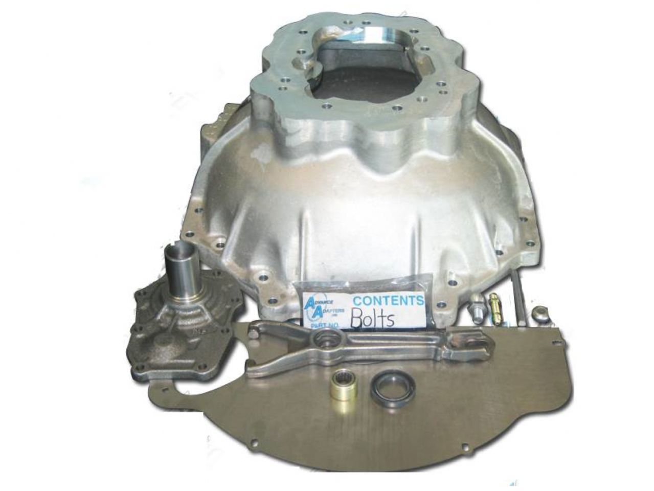 This adapter bellhousing assembly is used to adapt the GM 4.3, V8 to the Jeep AX5, 5 speed manual transmissions. The bellhousing kit includes a 356 T-6 aluminum bellhousing, universal dust cover plate, pilot bushing, AX5 bearing retainer assembly, seal, throw-out arm, slave cylinder push rod, slave cylinder push rod end, ball pivot, fastening hardware, and adapter instructions.