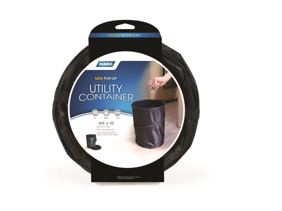 Camco's RV Mini Pop-up Utility Container measures 9-1/2" by 13". It is handy to use as a small trash can or storage container. It collapses down to 2-1/2" for storage and has a built-in storage strap. The base has hook-and-loop tape to help hold it in place.