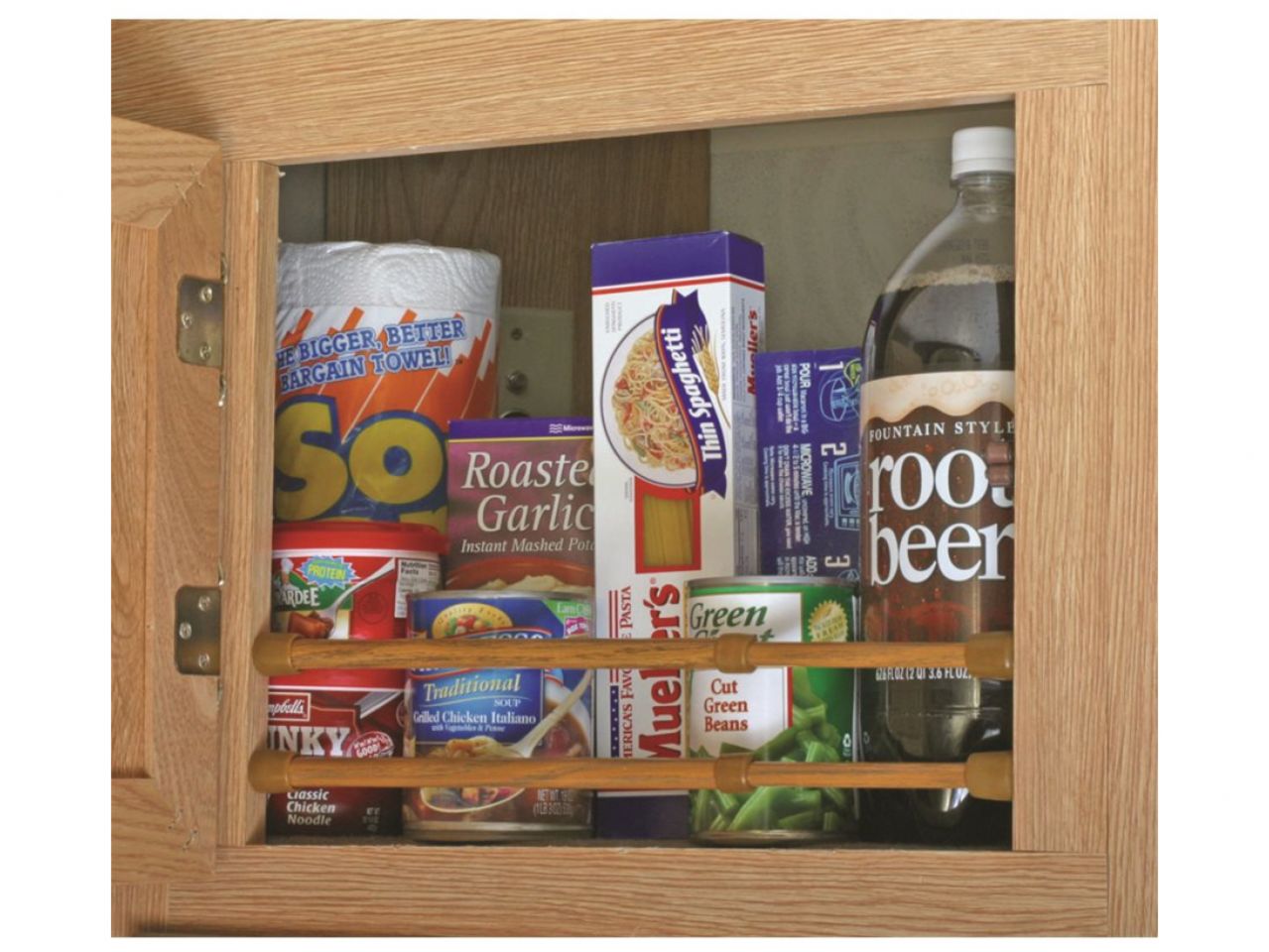 - Spring loaded bars keep items in place in RV cupboard