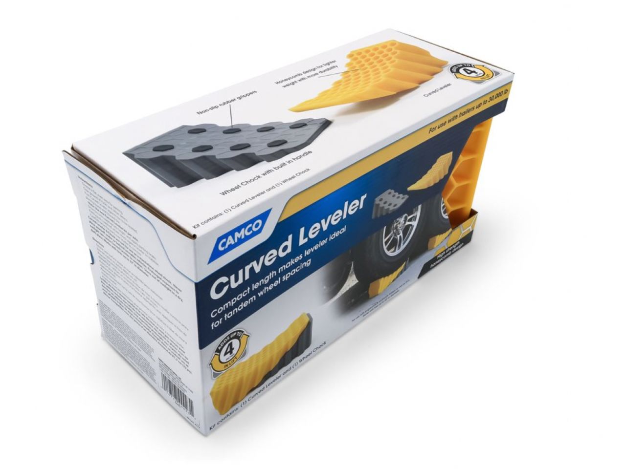 The Camco Curved Leveler is a simple way to level your vehicle by give a tire up to 4 extra inches of lift. The honeycomb design makes the leveler lightweight but durable. The drive-on curved design allows you to only drive on to as much height as needed, then chock the leveler at the exact right height. The included clock has non-slip rubber grippers on the bottom.