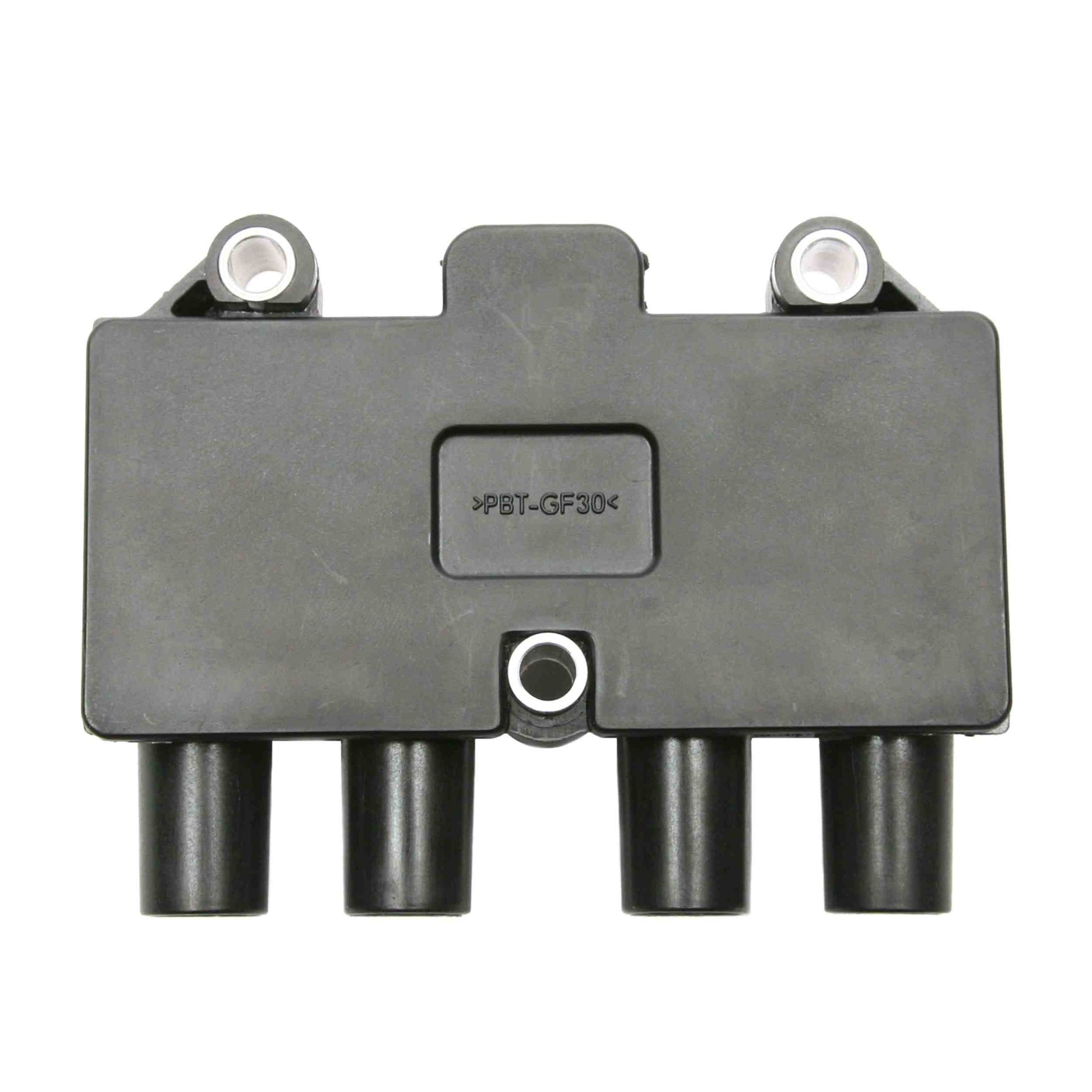 An induction coil, used with a distributor for timing, to transform a vehicles battery voltage to a much higher voltage needed to create proper spark for all spark plugs of an engine. (GN10230) by Delphi