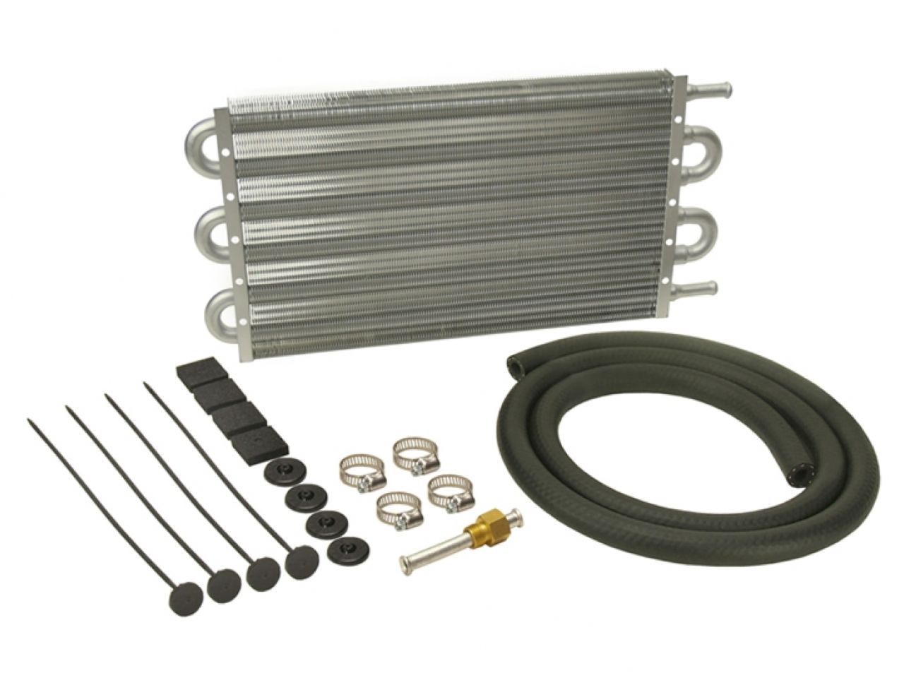 This universal all-aluminum transmission cooler is perfect for today's highly-stressed mid to full-size car and mid-size truck automatic transmissions. Featuring embossed turbulators inserted into full 1/2" tubing to agitate fluid and louvered cooling fins, it extends transmission life by helping to prevent heat-related transmission failures while improving shift performance. This kit comes with a complete transmission cooler hardware kit to easily install onto vehicles with 5/16" transmission cooler lines.