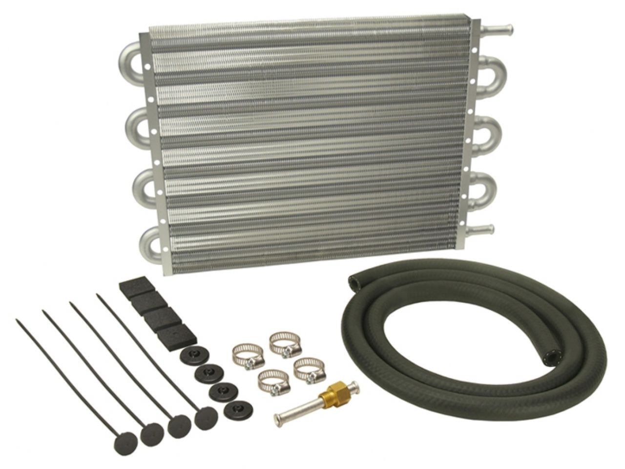 This universal all-aluminum transmission cooler is perfect for today's full-size car and truck automatic transmissions. Featuring embossed turbulators inserted into full 1/2" tubing to agitate fluid and louvered cooling fins, it extends transmission life by helping to prevent heat-related transmission failures while improving shift performance. This kit comes with a complete transmission cooler hardware kit to easily install onto vehicles with 5/16" transmission cooler lines.