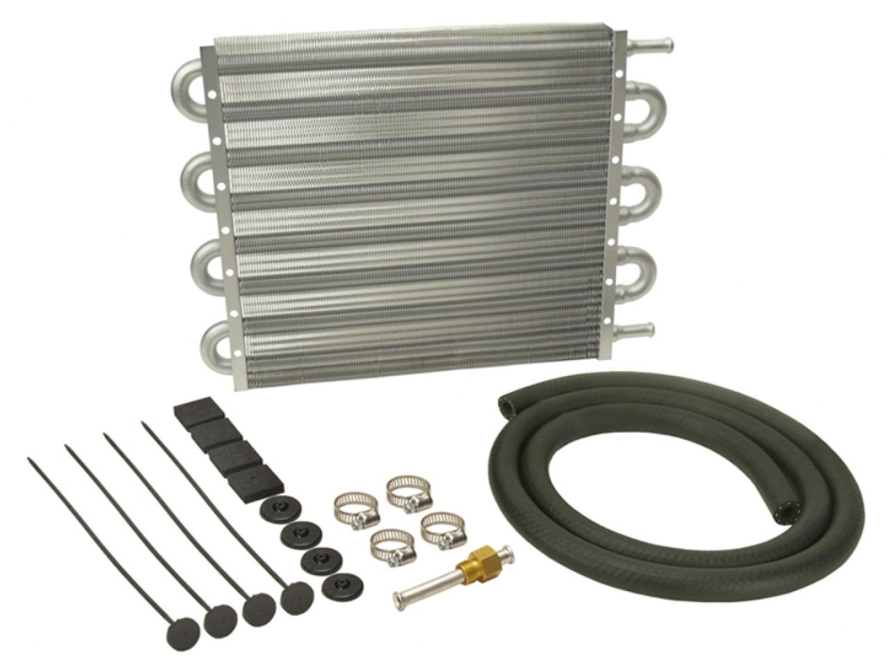 This universal all-aluminum transmission cooler is perfect for today's mid to full-size car automatic transmissions. Featuring embossed turbulators inserted into full 1/2" tubing to agitate fluid and louvered cooling fins, it extends transmission life by helping to prevent heat-related transmission failures while improving shift performance. This kit comes with a complete transmission cooler hardware kit to easily install onto vehicles with 5/16" transmission cooler lines.