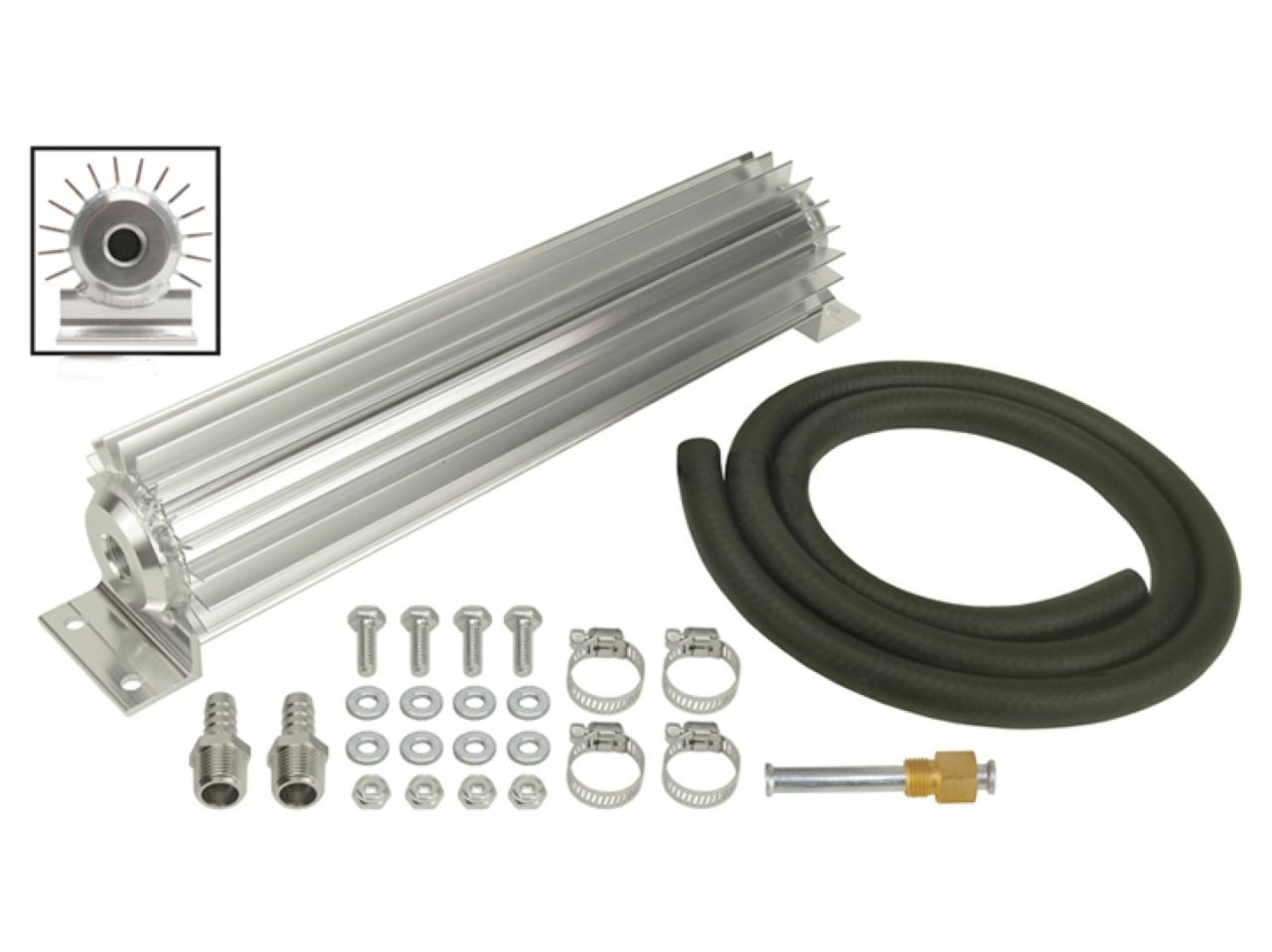 This all aluminum Heat Sink cooler uses both external and internal fins to maximize heat transfer. With a 3" diameter it can be mounted in a variety of locations. This kit comes with a complete transmission cooler hardware kit to easily install onto vehicles with 5/16" transmission cooler lines, making it a perfect solution for light duty transmission cooling needs.
