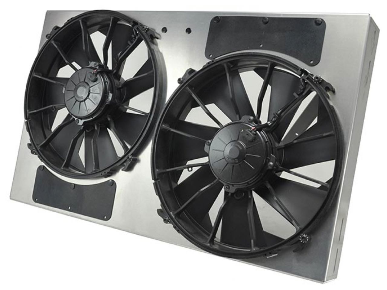 This Dual High Output RAD Fan Assembly allows true Dual Fan performance in a package the size of others Single shrouded fans. Featuring an aluminum shroud measuring a tidy 24" wide by 15 1/2" top to bottom and only 4 1/2" in overall depth to offer an adjustable yet precision fit, it uses two IP-68 certified waterproof/dustproof 11" electric fans to provide a powerful one-two 3750 cfm punch to a hot engine. The natural, non-finished aluminum shroud gives the user the freedom to polish, anodize, paint, or simply leave it raw to create a truly custom look at a reasonable price.