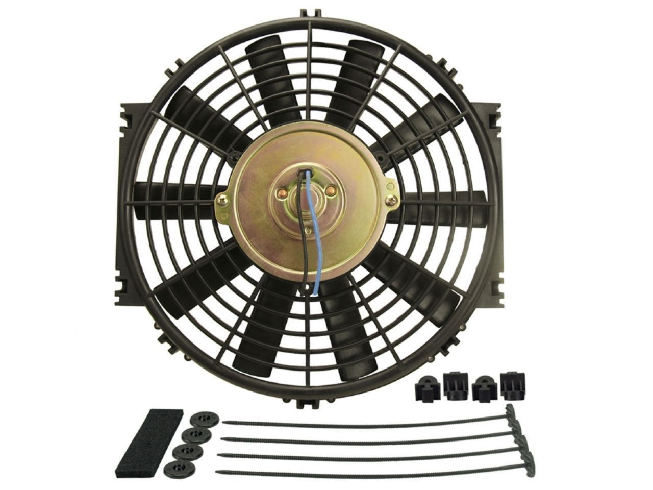 Our 10" straight blade electric fan moves 500 CFM at 0 static pressure, drawing only 6.4 amps. Included with each kit: fan mounting kit with 4 plastic through-radiator core rods and clips, 4 foam pads and 4 mounting feet.