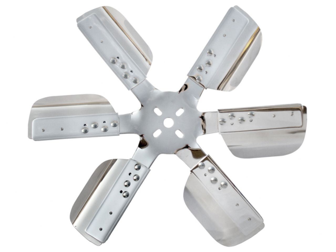 This 18" heavy duty reverse rotation fan features beautifully polished and chrome plated steel hubs and 6 polished stainless reinforced blades with a large surface area that improve performance and fuel economy and is rated up to 10,000 rpm. The large surface area of the blades pull more air at lower speeds than other flex fans.