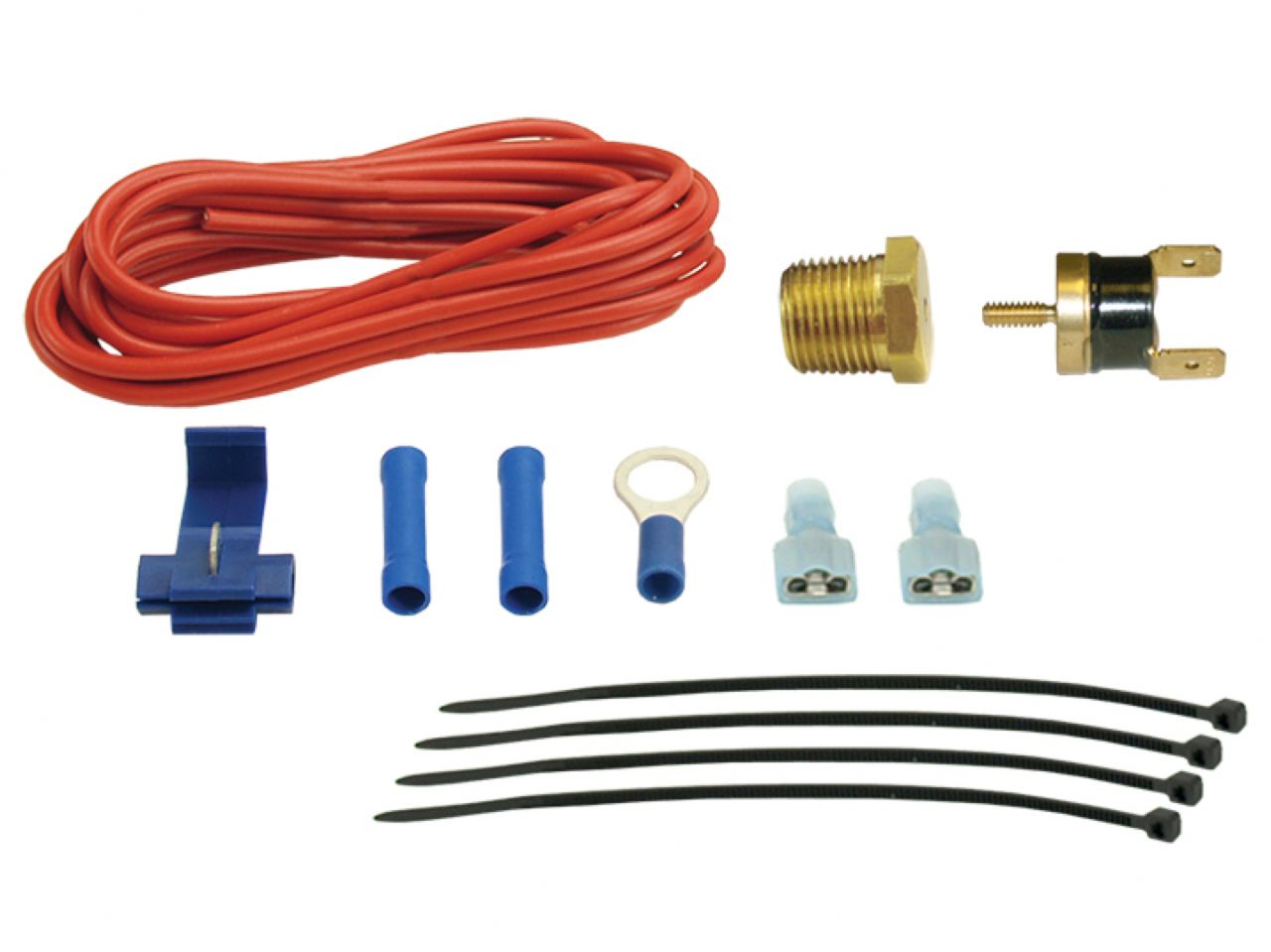 This 180°F-on/165°F-off electric fan control kit is designed to activate 1 fan with a maximum draw of 15 amps. Includes water jacket 3/8" NPT thread-in probe, wire and electrical connectors for an easy installation.
