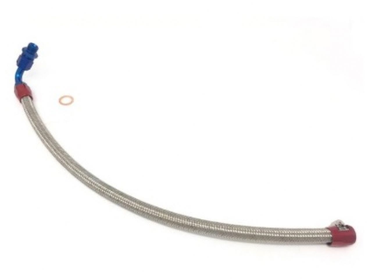 Replacement steel braided coolant line for SR20DET turbos in a 240sx. 18 inches long, 90 deg AN fitting to straight hose clamp. Pressure rated to 6000 PSI.