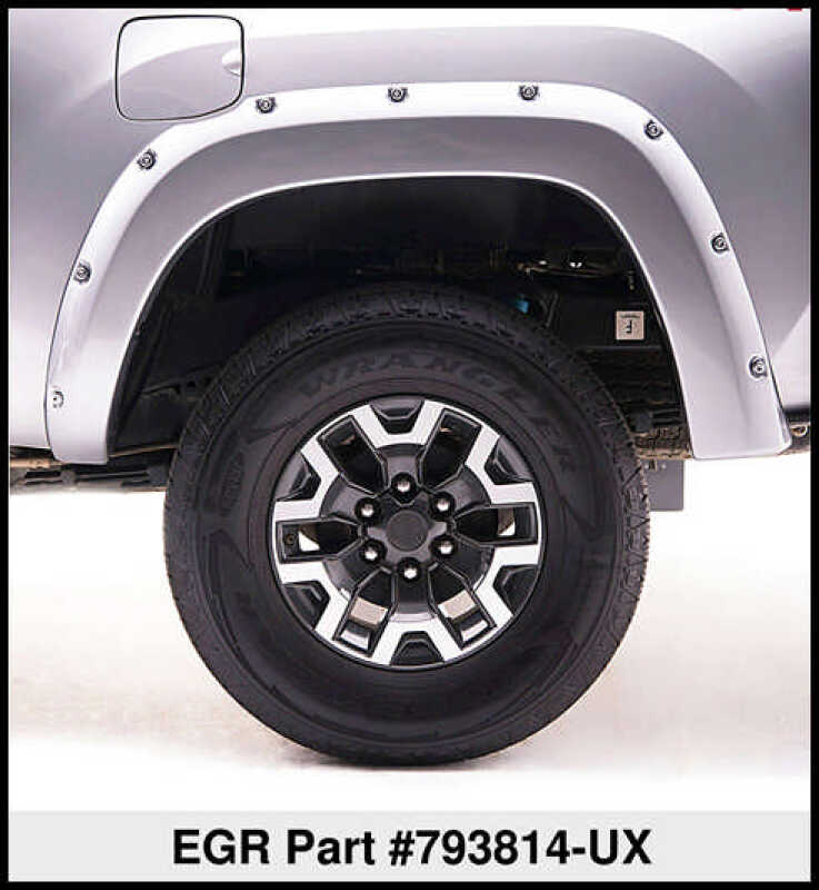 EGR Fender Flares 793814-UX EGR Bolt On Look Color Match Fender Flares feature OEM quality, no drill fixing system, combined with easy to follow installation instructions make them the perfect DIY upgrade for your vehicle. The fully color matched Fender Flares increase tire coverage of your fenders by up to 2 inches. EGR Color Match Fender Flares feature preinstalled protective rubber trim and chrome finished decorative bolts for a hassle free installation in minutes. Guaranteed to match the factory color. BOLT-ON FF SET COLOR MATCH Bolt-On Look Color Match Fender Flare Set of 4; No-Drill; Front And Rear; Ingot Silver; Bolt-On Style