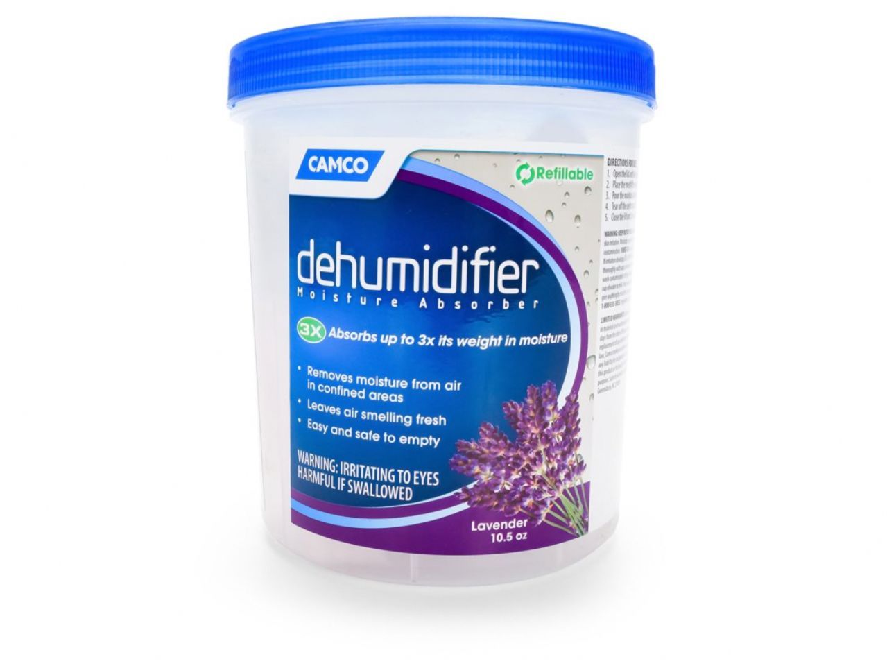 The Camco Moisture Absorber is an easy way to reduce humidity in your basement, closet, bathroom, boat, RV or any confined area! The moisture-absorbing agent acts fast to trap humidity and lavender-scented fragrance beads keep the air smelling fresh. One container of media will absorb up to three times its weight in water, and when it's done you can safely empty and refill it over and over again.