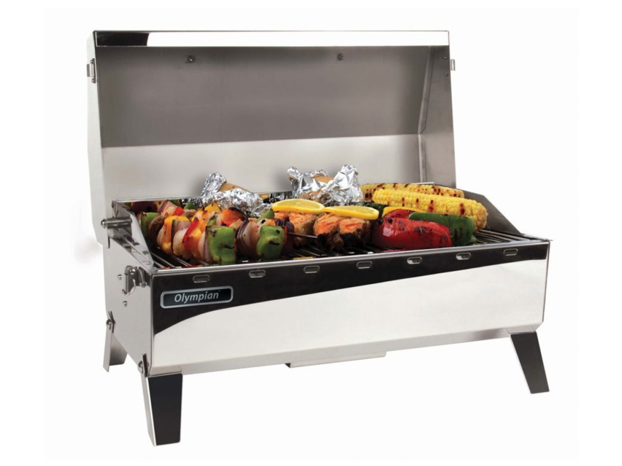 The Camco Olympian 4500 Stainless Steel Gas Grill is designed for outdoor use. It is compatible with 1 lb throwaway propane cylinders. This high quality lightweight stainless steel barbecue increases flavor while minimizing flare-ups. It has a large cooking area of 160 square inches, and the stainless steel burner heats up fast, is easy to clean, and resists rust. The integrating folding legs are perfect for tabletop use and the grill is quick and easy to assemble.