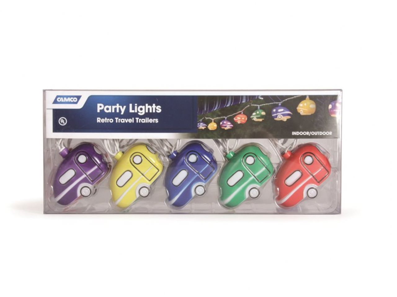 Camco RV Retro Travel Trailer Party Light add a festive glow to your outdoor living area. Each 8-foot strand contains ten lights, and end connector for hooking strands together. UL approved for indoor and outdoor use. Set includes two spare bulbs and a spare fuse.