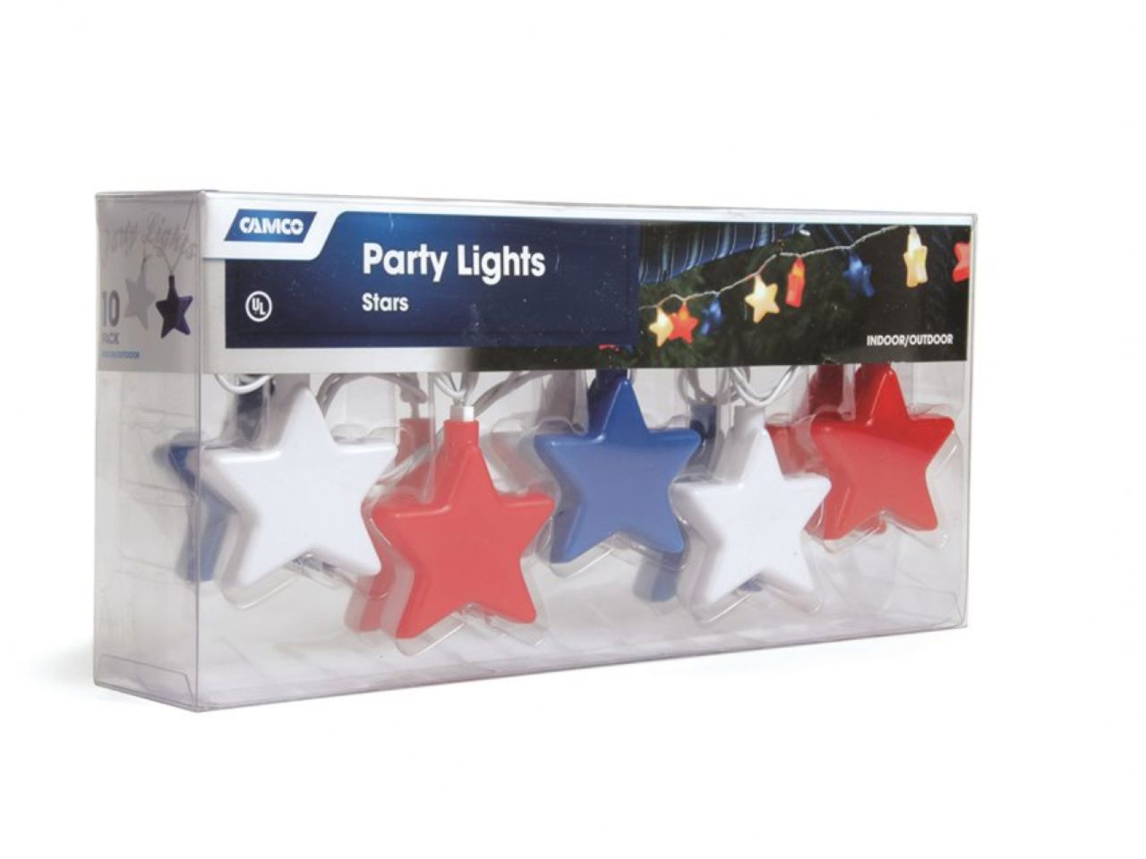 Camco RV Patriotic Star Party Light add a festive glow to your outdoor living area. Each 8-foot strand contains ten lights, and end connector for hooking strands together. UL approved for indoor and outdoor use. Set includes two spare bulbs and a spare fuse.