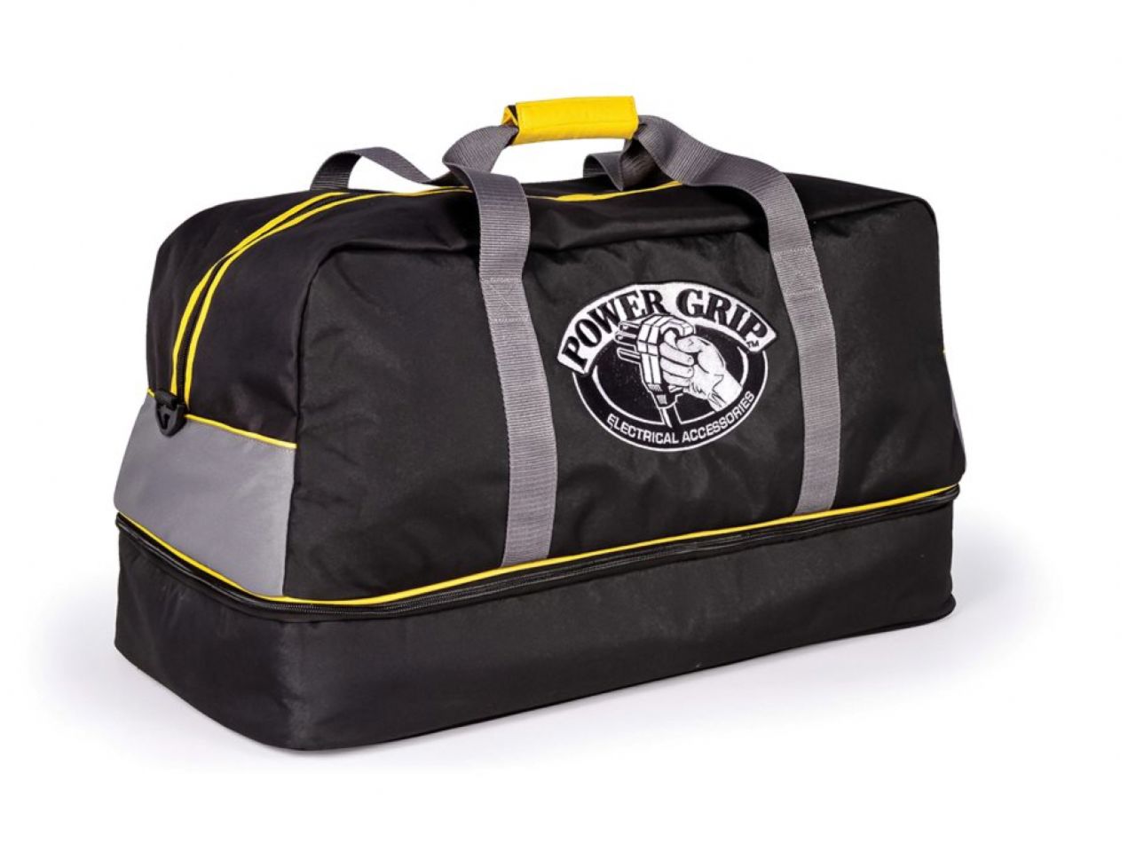 High quality duffel bag stores Power Grip extension cords and accessories. The large main compartment is big enough for a 50-foot extension cord, and the bottom compartment has separate, padded areas to protect accessories. The easy to carry duffel has two handles on the top, or a long, removable shoulder strap that attaches end to end. Duffel is made of heavy duty material and stitching.