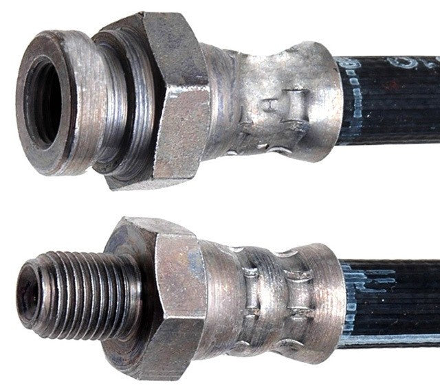 A flexible hose, typically used on moving parts of a vehicle, which carries / delivers fluid to various components of the braking system. (BH36888) by Raybestos Brakes