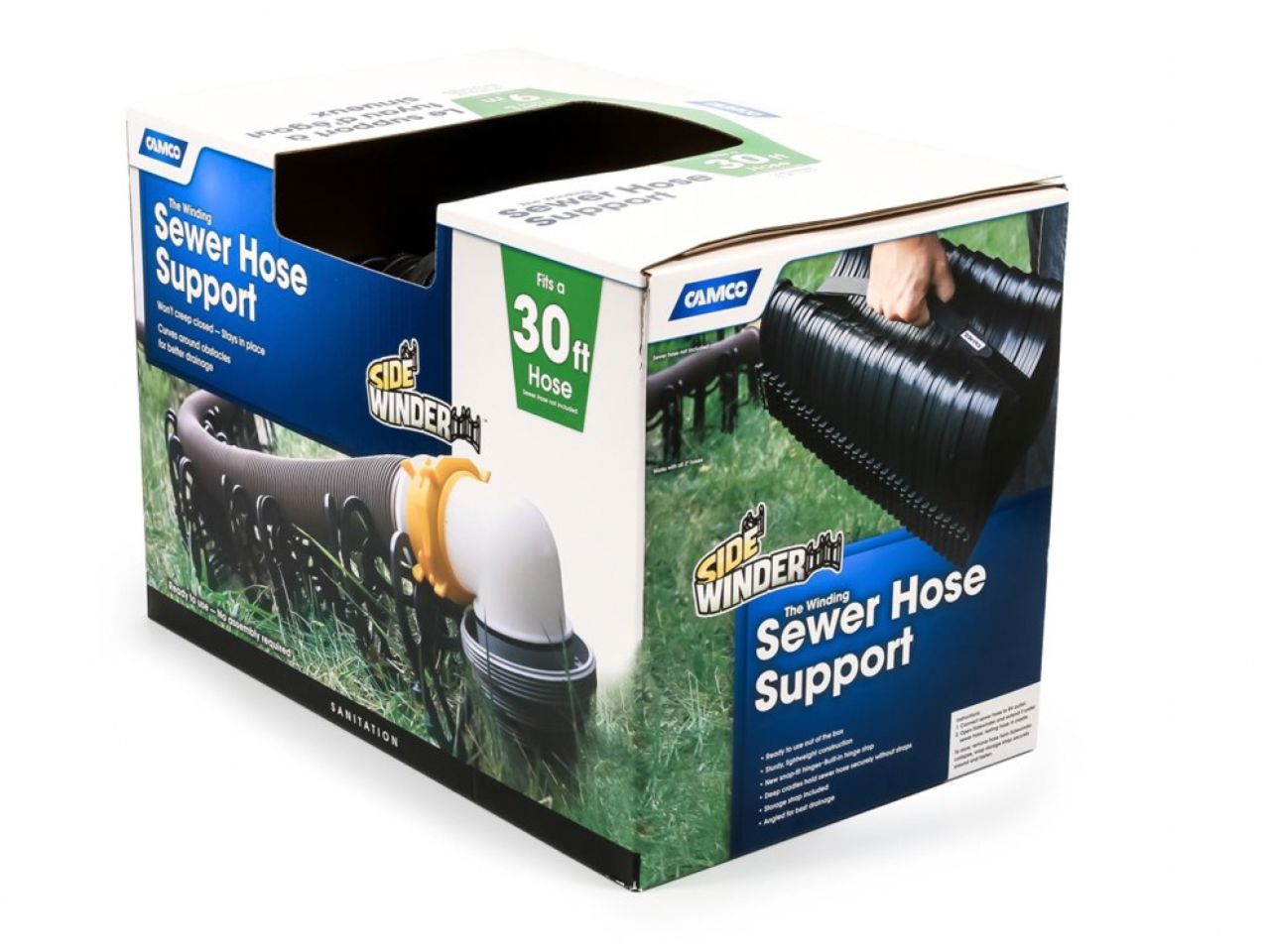 Camco RV 30' Sidewinder Plastic Sewer Hose Support is sturdy and lightweight. Plastic support with strong snap-fit hinges has deep cradles to hold sewer hose in place without straps. No staples to rust. Easily positions around obstacles and stays where you put it. Won't creep closed. The bottom of the Sidewinder cradle is 7.25" high at its higest point and 4" high at its lowest point. Patented.