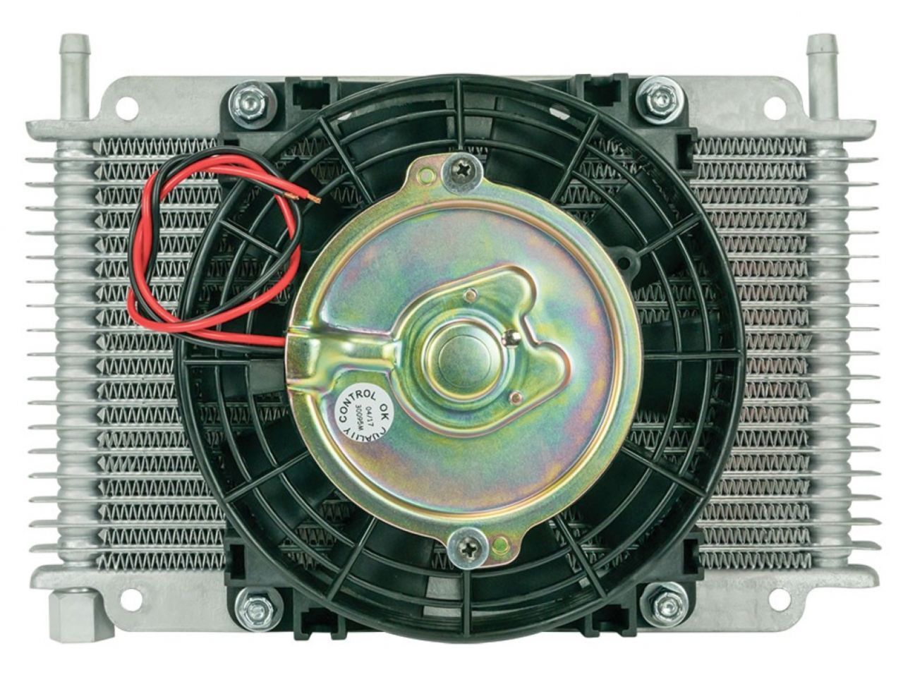 This Flex-A-Lite stacked-plate, 17-row transmission cooler is designed for remote mounting and comes with a 6.5-inch electric fan mounted. It measures 11 x 6 x 3 1/4 inches and has 3/8 inch barbed fittings.